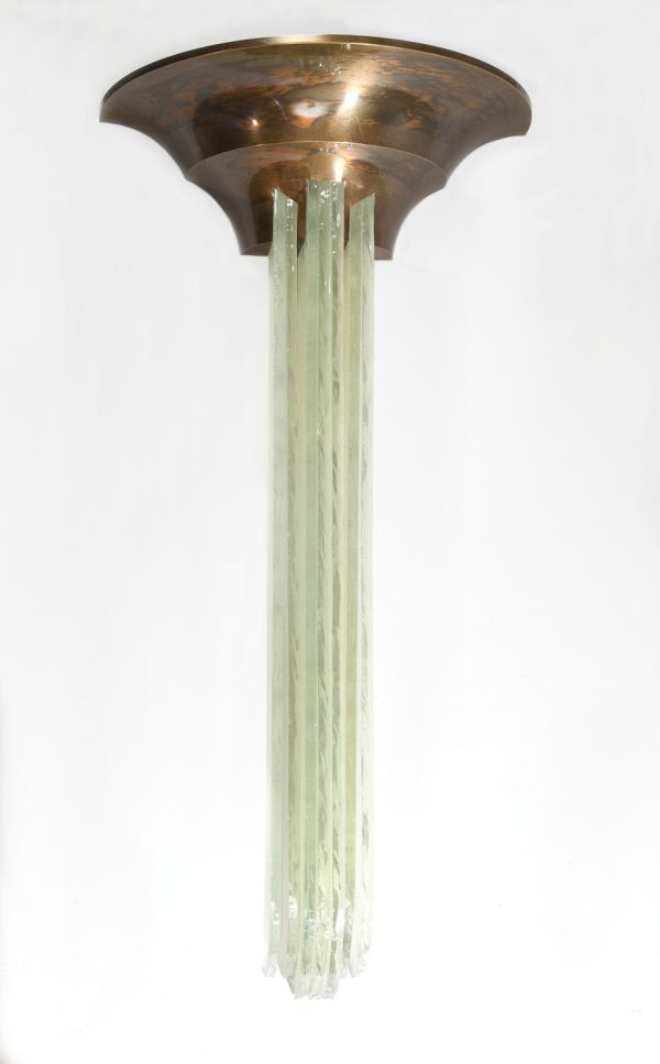 Demi-coupe repoussée en profil double cavet, formant réflecteur d'éclairage indirect, avec monture intérieure, portant 7 glaces brut dépolies et sur, champs pendants en longueur, extrémités quart de cercle, les bords de ces glaces martelées et dépoliés donnant en épaisseur des jeux de lumière pris dans la coupe.